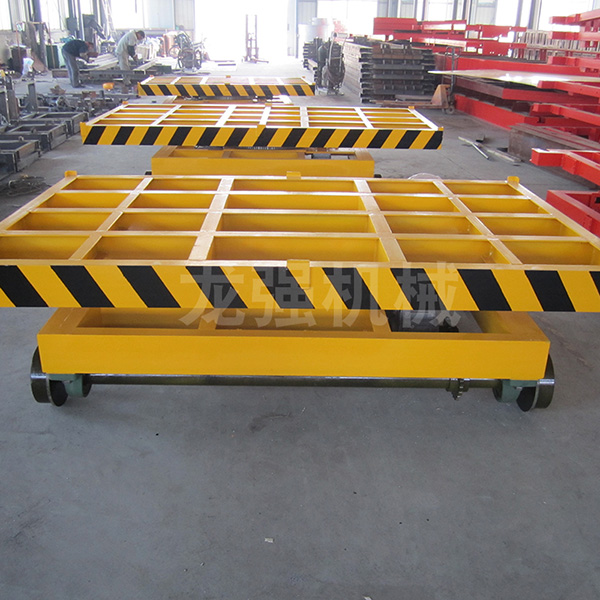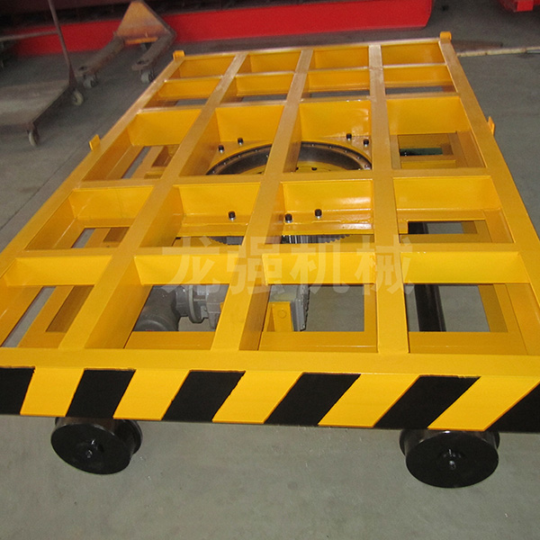 KPT系列電動(dòng)平車由防爆電機(jī)連接減速機(jī)減速后,通過鏈輪鏈條旋轉(zhuǎn)而帶動(dòng)電動(dòng)平車滾輪在軌道上行走。電動(dòng)平車運(yùn)行時(shí),平臺(tái)下方固定連接坦克連一頭,另一頭固定在地平面的溝槽中,坦克連放平后厚度不會(huì)高出地平面,不會(huì)影響日常其他設(shè)備的運(yùn)作。電纜經(jīng)坦克鏈直接給電機(jī)供電。坦克鏈電纜的一端經(jīng)地面預(yù)埋管直接到控制柜中,另一端經(jīng)電動(dòng)平車的固定裝置引入平車。該型電動(dòng)平車的特點(diǎn)是臺(tái)面高度較低,裝卸重物容易,但運(yùn)行距離不能太長(zhǎng),一般不能超過50m,過長(zhǎng)電纜重,坦克鏈會(huì)下垂。